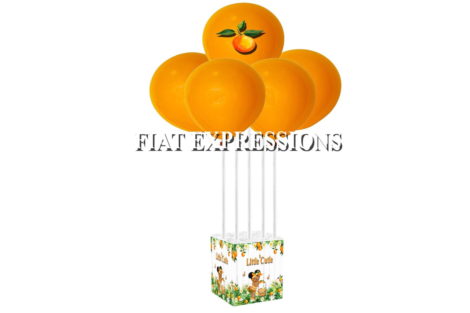 Cutie Girl Orange Balloon Bouquet is a cute & tall table centerpiece for a baby shower. You may pair our balloon centerpieces with one of our diaper cakes, baby centerpieces, backdrops or edible cake images. This balloon bouquet comes with the following: