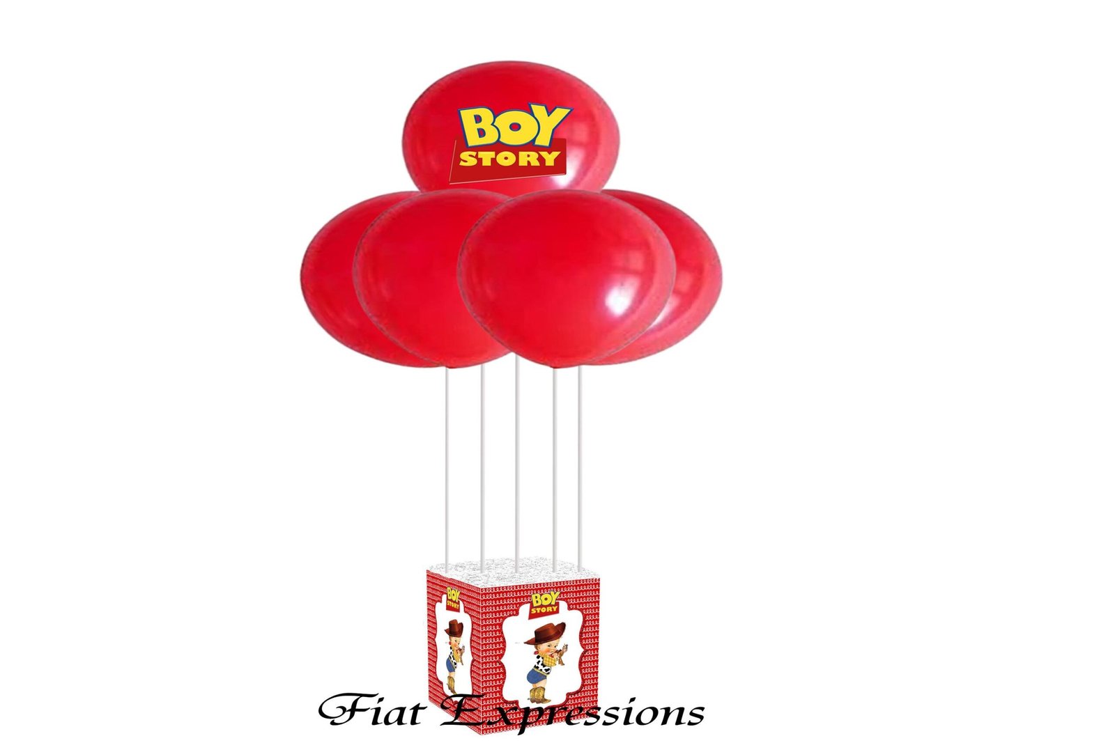 Our Boy Story balloon bouquets will elegantly decorate a Boy Story baby shower. Our balloon bouquets are able to stand on its own without any helium. You may pair our balloon bouquets with one of our boy story diaper cakes, baby centerpieces, backdrops or edible cake images. This balloon bouquet comes with the following:
