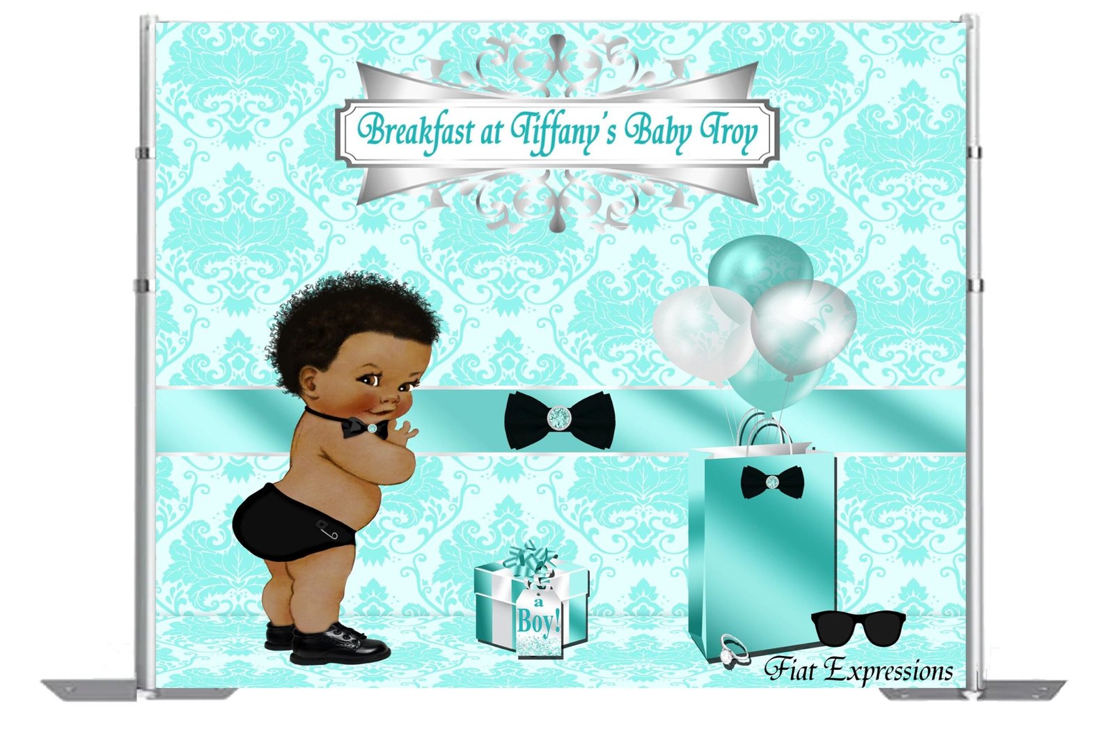 You may pair our Breaks at Tiffany’s backdrop with one of our Breakfasts at Tiffany’s girl diaper cake, baby centerpiece, balloon bouquet or edible cake image for an additional price.
