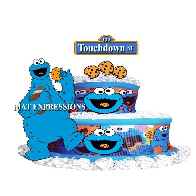 Cookie Diaper Cake, Monster Diaper Cake, 2 Tier Burp Cloth with football/Cookie Monster Inspired Baby Shower Centerpiece and Gift