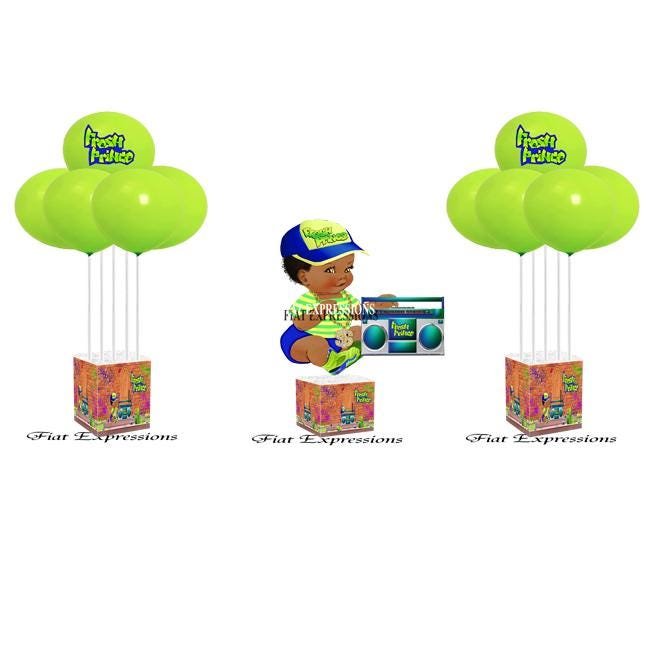 Fresh Prince Sitting Baby Shower Centerpiece & Balloon Bouquet Set Orange & Green comes with three or more centerpieces to decorate your baby shower. This set comes with a baby centerpiece & balloon bouquets. Our sets come in 3, 5, 6, 8, or 9. The basic 3 Centerpiece Set comes with the following: