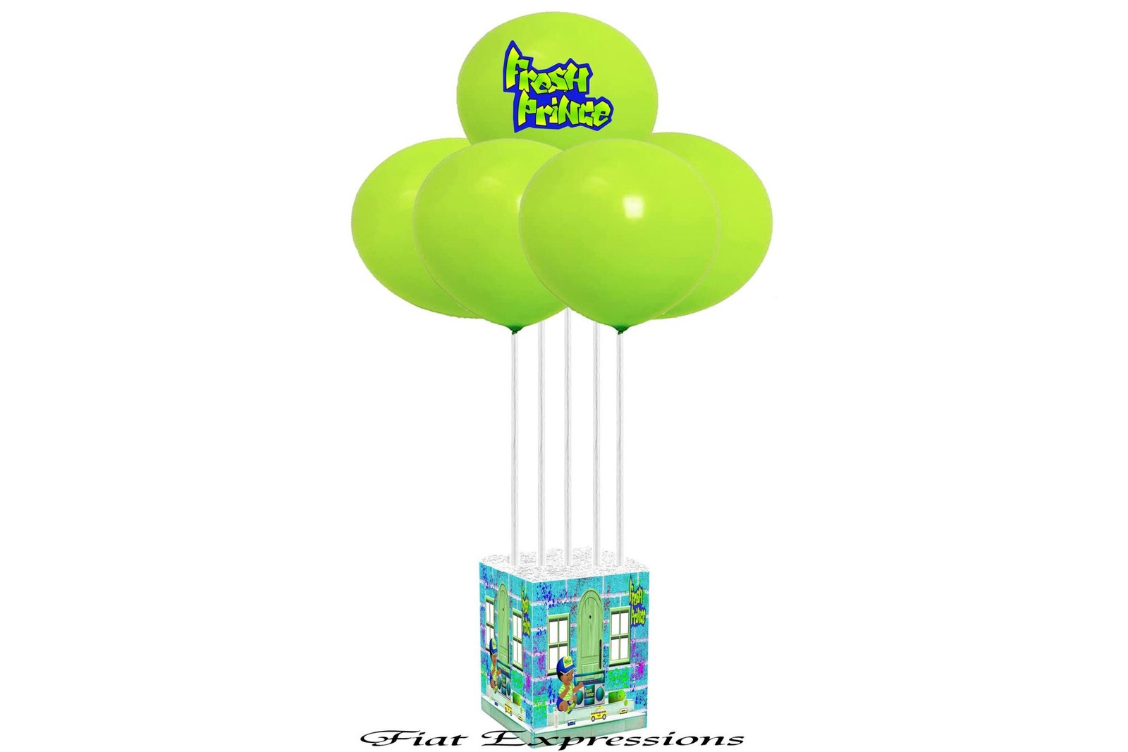 Our Fresh Prince balloon bouquets will elegantly decorate a Fresh Prince baby shower. Our balloon bouquets are able to stand on its own without any helium. You may pair our balloon bouquets with one of our fresh prince diaper cakes, baby centerpieces, backdrops or edible cake images. This balloon bouquet comes with the following: