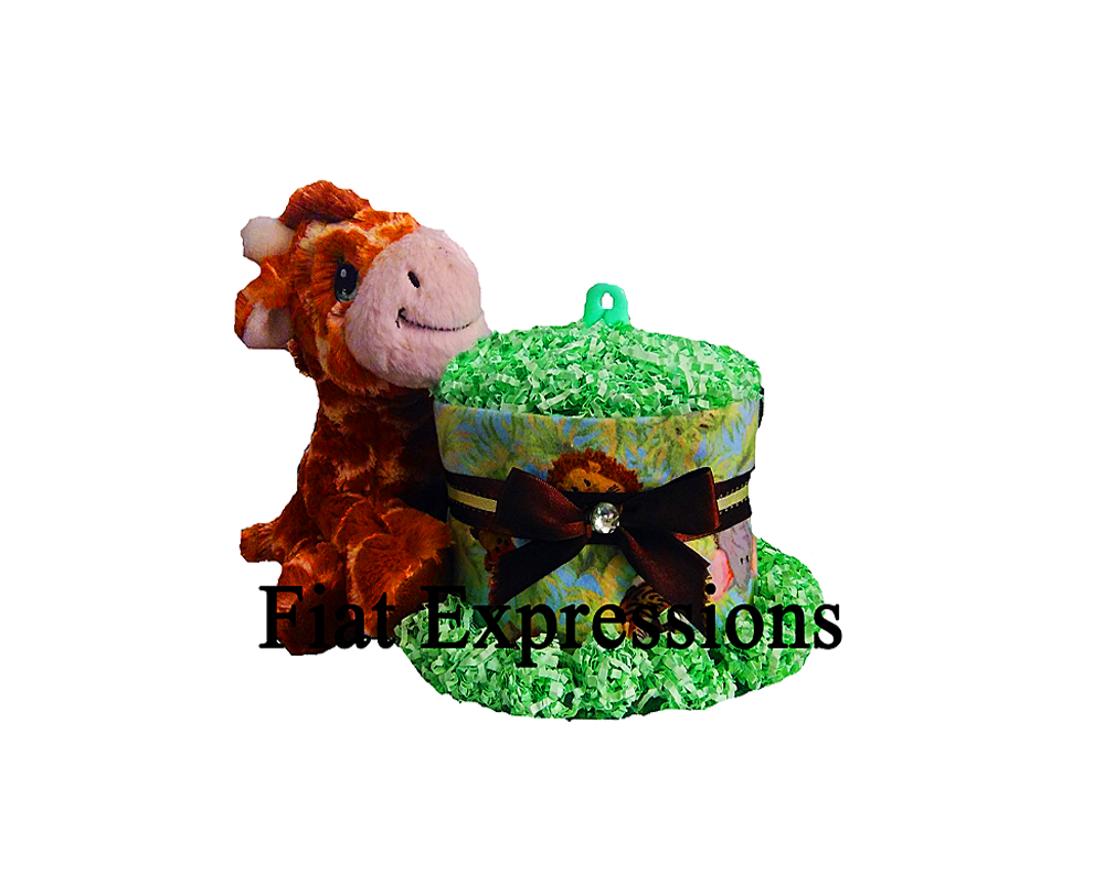 Jungle Safari Diaper Cake Green with Giraffe is a gift & centerpiece that will help decorate your baby shower. It is loaded with many baby items. You may select your choice of diapers (Luvs or Pampers). This diaper cake comes as a mini, standard, deluxe, or grand. The diaper cake comes with the following:
