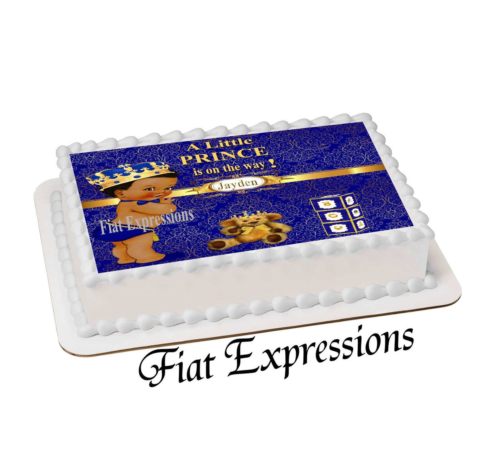 Prince Baby Shower Edible Cake Image Blue & Gold Digital File is a creative way to decorate your baby shower cake. Our digital cake image designs are for sheet cakes or round cakes. You may select your choice of baby. This product is for Personal Use ONLY! This product is not for commercial use! We can customized the wording for you! This file will be email to the customer within 1-3 business days. This is not a physical product. The customer is responsible for getting the file printed at a local bakery or bakery supply store. We do not offer refund to digital files. We do not offer refund to any digital file and/or digital product.