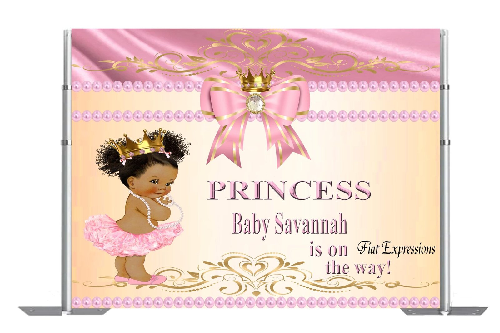 You may pair our Princess backdrop with one of our diaper cake, baby centerpiece, balloon bouquet or edible cake image for an additional price.