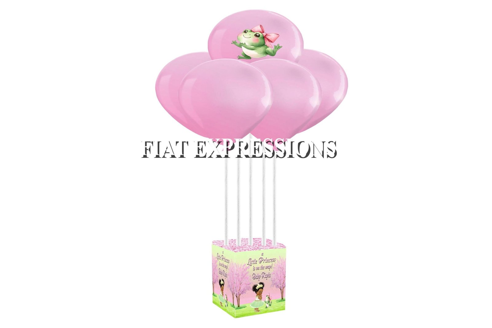 Our Princess balloon bouquets will elegantly decorate a princess baby shower. Our balloon bouquets are able to stand on its own without any helium. You may pair our balloon bouquets with one of our diaper cakes, baby centerpieces, backdrops or edible cake images for an additional cost.