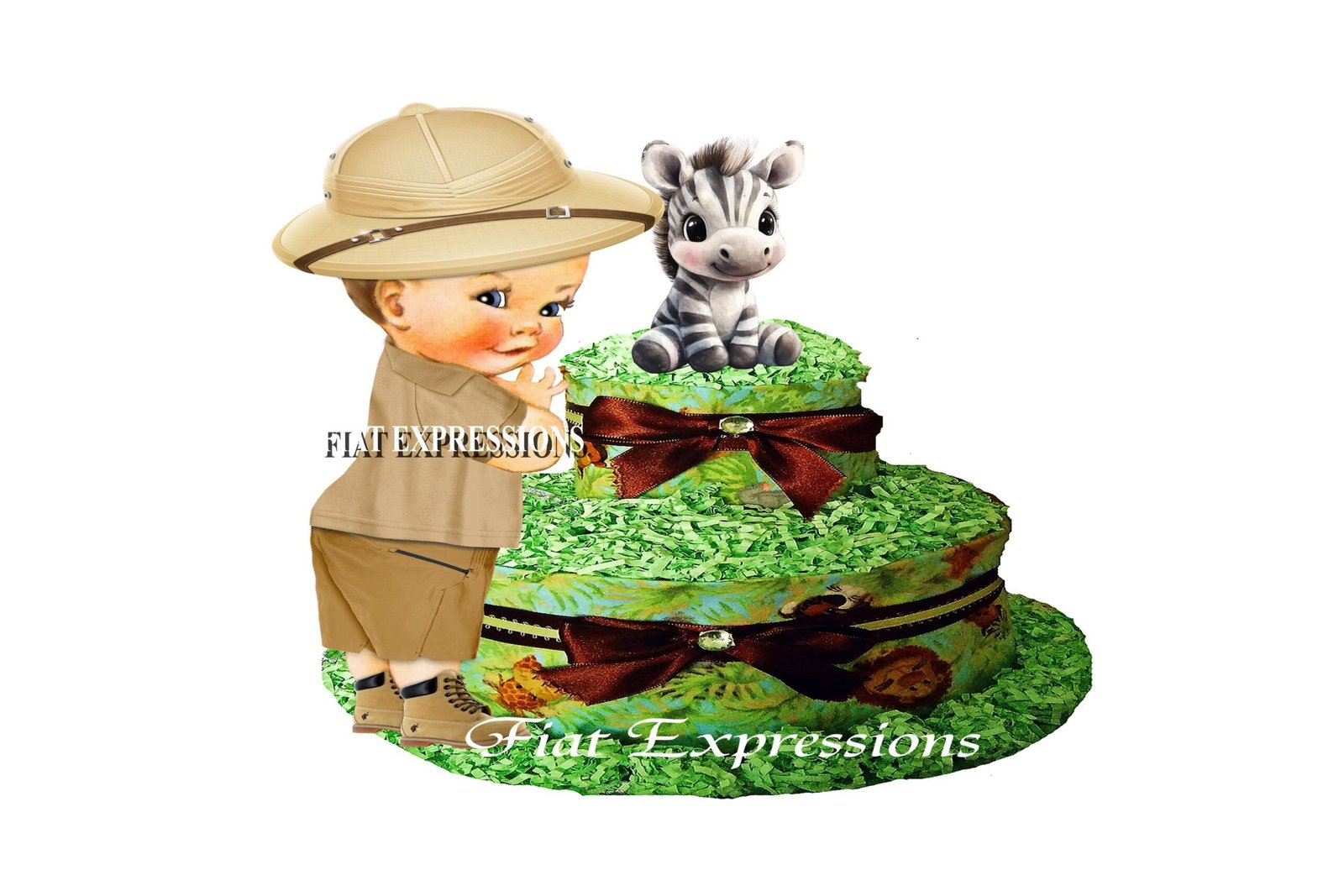 Safari Boy Green 2 Tier Diaper Cake can be used as a gift & centerpiece at baby shower. You may select your choice of diapers (Luvs or Pampers). There is an additional $2 fee for Pampers. This two-tier diaper cake comes with the following: