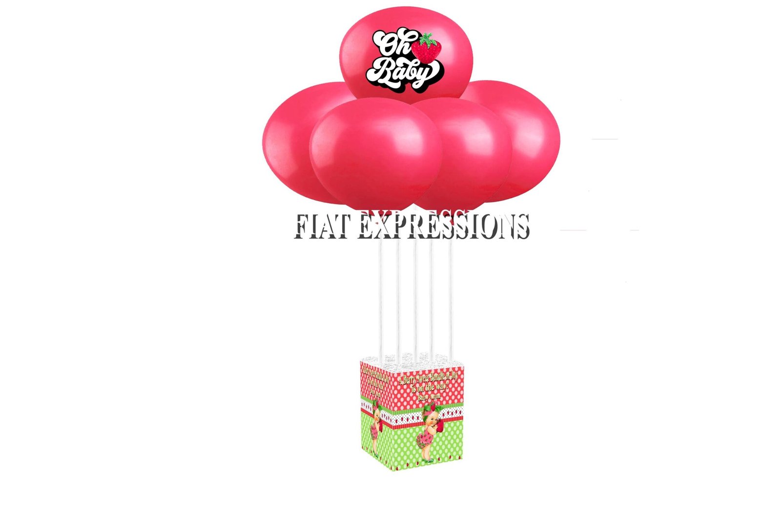 Our Strawberry balloon bouquets will elegantly decorate a strawberry baby shower. Our balloon bouquets are able to stand on its own without any helium. You may pair our balloon bouquets with one of our diaper cakes, baby centerpieces, backdrops or edible cake images for an additional cost.